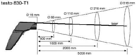 Пятно измерений имеет различный диаметр в зависимости от расстояния между пирометром и объектом измерения.